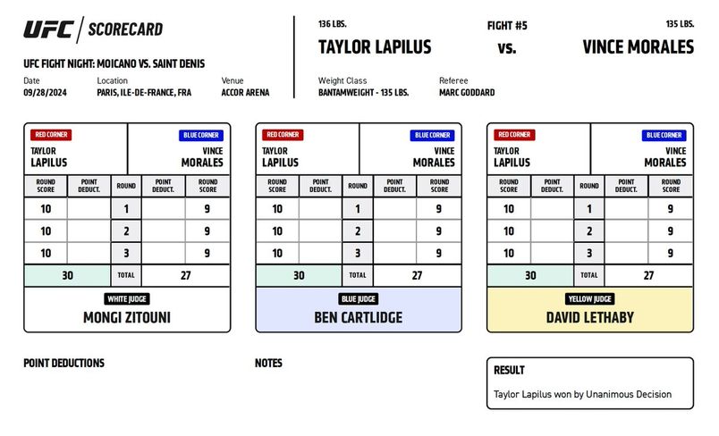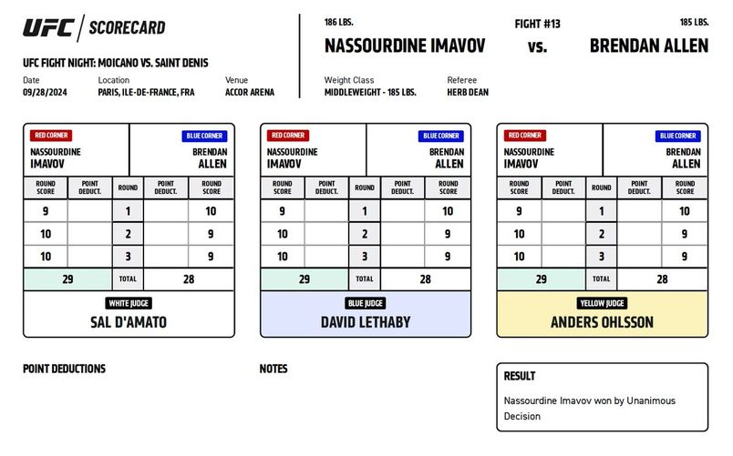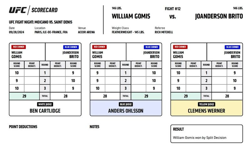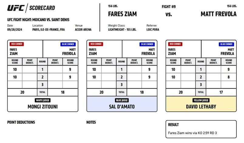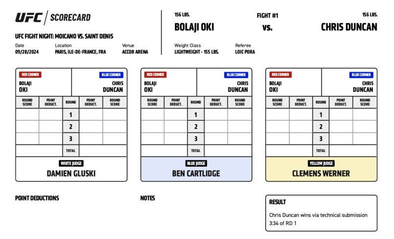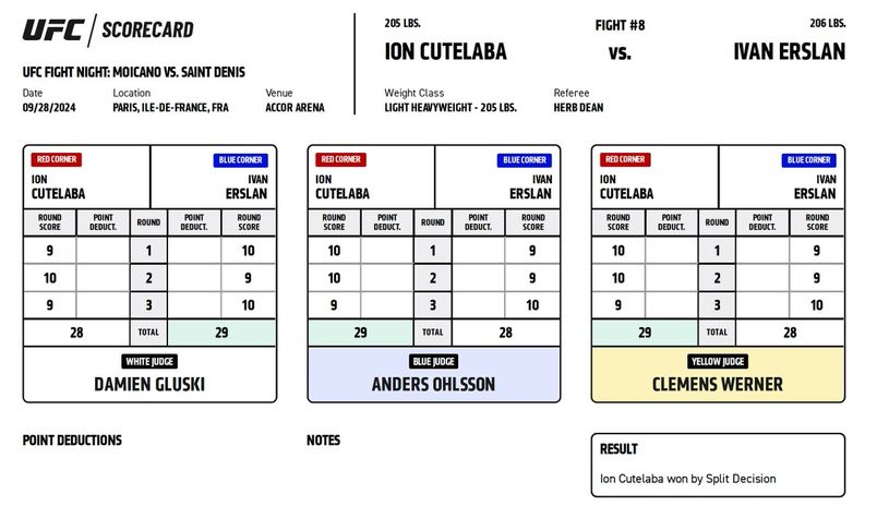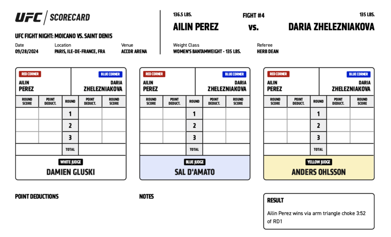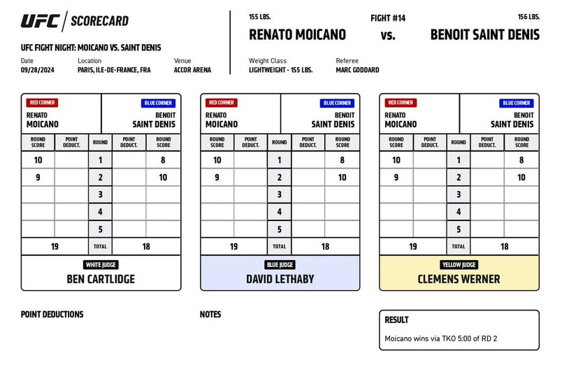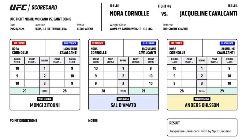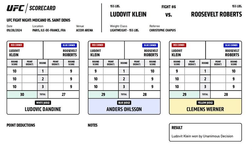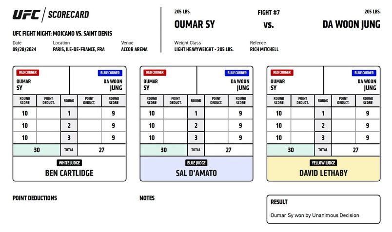 Официальные карточки судей за рингом ЮФС Париж. На основе этих протоколов принимается решение о победителя боя.